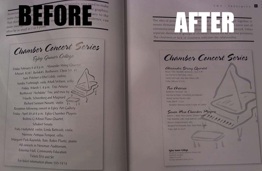 Items that aren't related shouldn't be close to other elements.When several items are close together they become one visual unit rather than several. Seperate information by grouping it. Information that is subsidiary to the main message doesn't have to be size 12 text, you can use size 7 or 8 font. Leave no "trapped" white space, it visually pushes elements apart if there are too many seperate items, group the ones that have relationships if there are areas where the organization isn't clear, check the item's proximity. The principle of alignment is to have it going from left to right so you can flush the left. Having all text in capitals can take up a lot of space you can use flush-left alignment to align elements together. Be conscious of where your eye is going and where you start looking avoid too many seperate elements on a page. Don't put things in the corners or the middle. Don't create relationships if items don't belong together